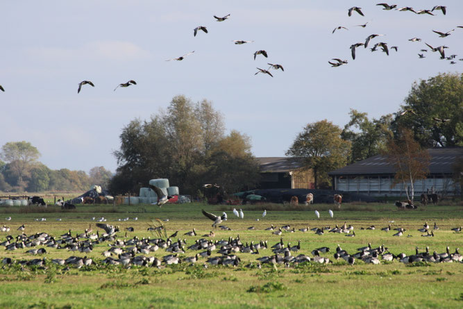 Höhepunkt der Führung findet am Dollart statt. Dort erwarten wir die Gänse, die hier in der Dämmerung an ihren Schlafflächen eintreffen. Bei diesem beeindruckenden Naturschauspiel probieren wir, was das Rheiderland Kulinarisches zu bieten hat: selbstgebackenes Brot, eine wärmende Suppe und selbst gepresste Obstsäfte von Rheiderländer Streuobstwiesen.